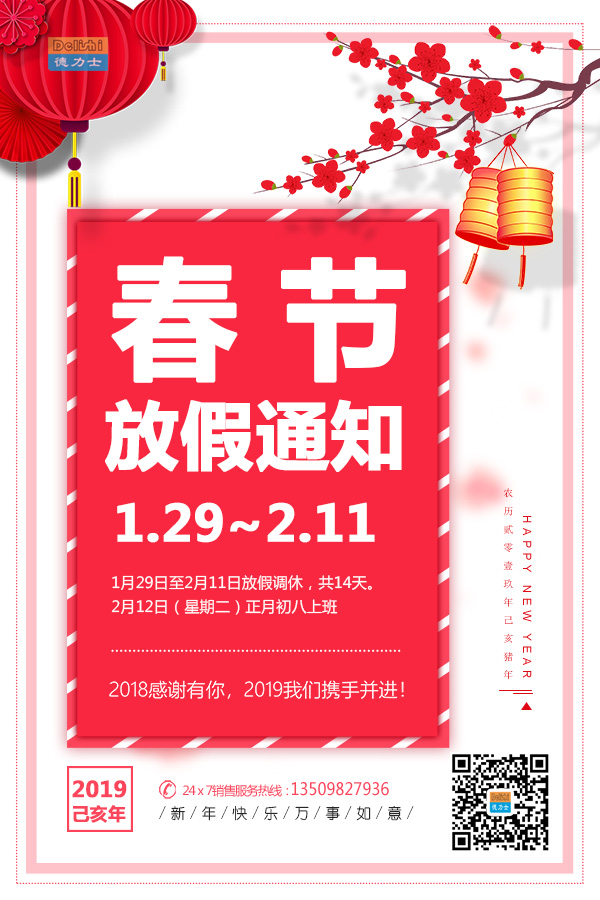 2018年匆匆过去,我们迎来了2019年。再过十来天,中国传统重大节日-春节就来临了。为了感谢恒行娱乐同仁们,18年辛勤的付出,特此我司春节假期安排如下:1月29日-2月11日春节调休,共计14天。春节假期,7*24小时销售服务热线13509827936 。在此,恒行娱乐液压机械提前祝贺:各位新老客户生意兴隆,阖家安康!